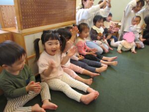 始めてお誕生会に参加する子ども達が多い中ですが、そらぐみさんが盛り上げて